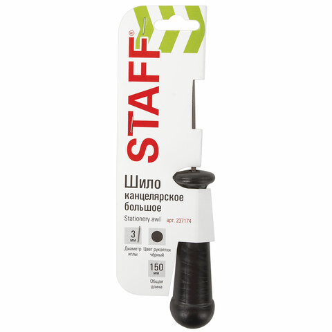 Шило канцелярское большое STAFF, общая длина 150 мм, диаметр иглы 3 мм, ручка черная, 237174