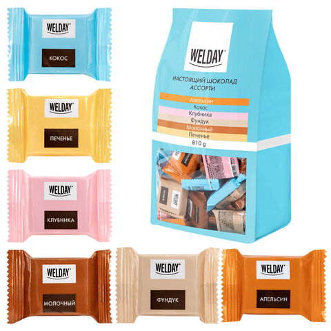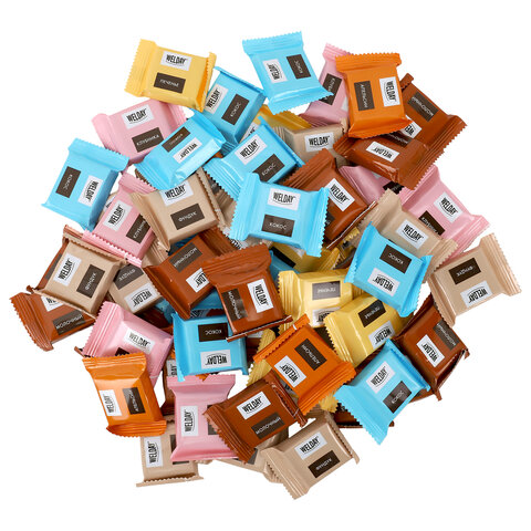 Шоколад порционный WELDAY (ВЭЛДЭЙ), ассорти 6 вкусов, 810 г (54 плитки по 15 г), пакет, 622409