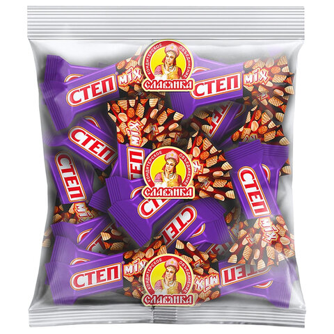 Славянка "Степ MIX" - хрустящие, вафельные с достаточным количеством арахиса, изюма и карамели конфеты, покрытые молочной глазурью. Аппетитные и привлекательные своим обилием орешков.