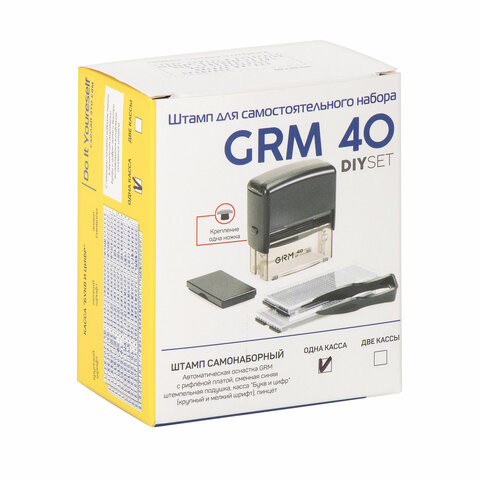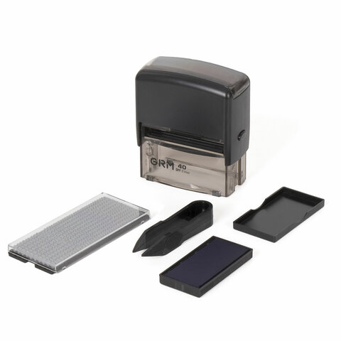 Изготовлен на основе оснастки GRM 40. Прозрачное окошко обеспечивает точное позиционирование оттиска. Специальные держатели позволяют не пачкать руки при смене подушки. Возможность нанесения логотипа на лицевую поверхность.