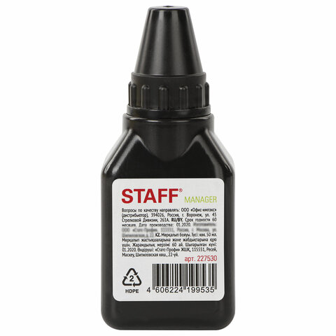 Штемпельная краска STAFF предназначена для заправки штемпельных подушек, используемых для всех видов ручных и автоматических оснасток печатей, штампов, нумераторов и датеров.
