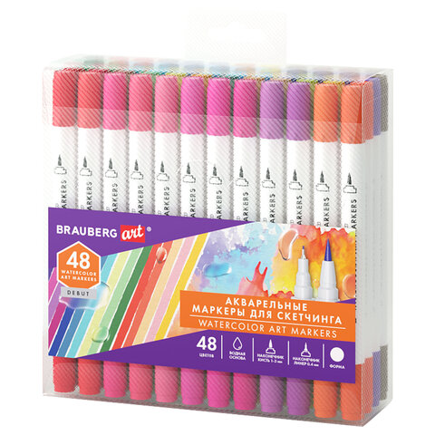 Маркеры акварельные для скетчинга двусторонние (кисть и линер) 48 цветов, BRAUBERG ART, 152667