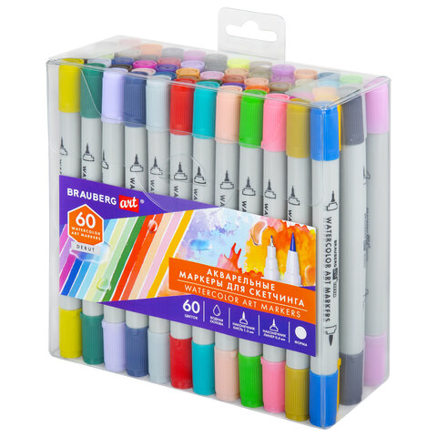 Маркеры акварельные для скетчинга двусторонние (кисть и линер) 60 цветов, BRAUBERG ART DEBUT. 152482