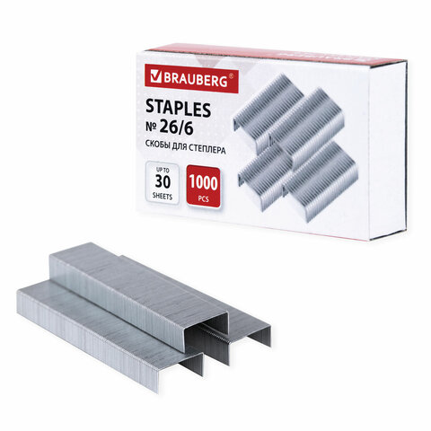 Скобы BRAUBERG № 26/6 (для степлеров 24/6), 1000 штук, экономичные, до 30 листов, 225973