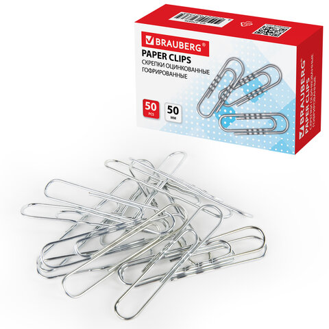 Скрепки большие 50 мм, BRAUBERG, оцинкованные, гофрированные, 50 шт., в картонной коробке, 270446