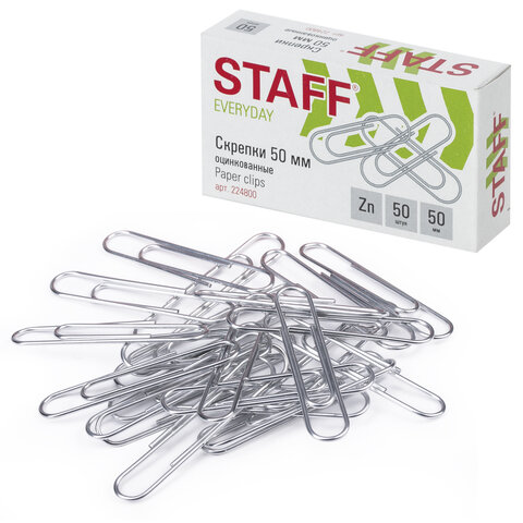 Скрепки большие 50 мм, STAFF, оцинкованные, 50 шт., в картонной коробке, РОССИЯ, 224800