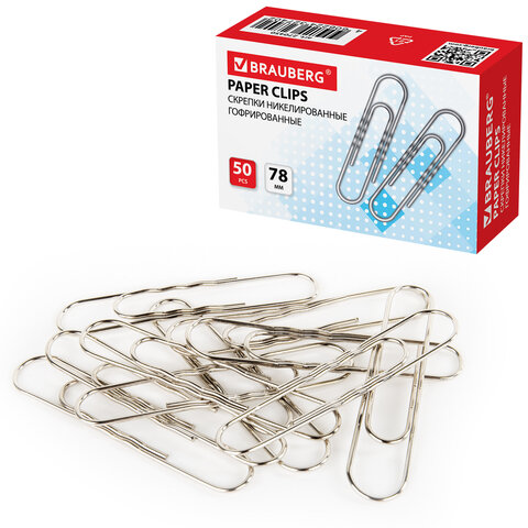 Скрепки большие 78 мм, BRAUBERG, никелированные, гофрированные, 50 шт., в картонной коробке, 270450