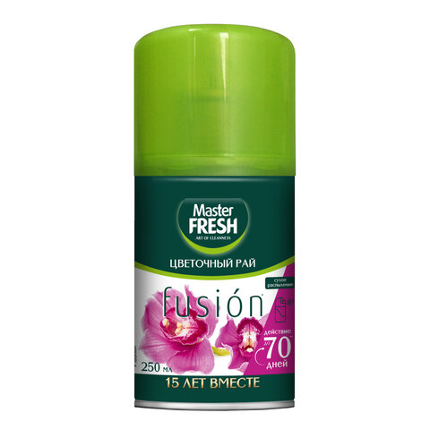 Сменный баллон 250мл MASTER FRESH "Цветочный рай" для автоматических освежителей подходит для большинства автоматических систем. Предназначен для постоянной ароматизации воздуха в любом помещении. Действует до 70 дней.