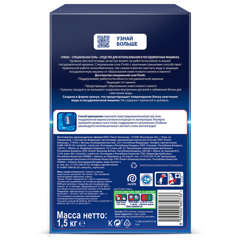 Соль для смягчения воды и удаления накипи в посудомоечных машинах 1,5 кг FINISH, 3012703