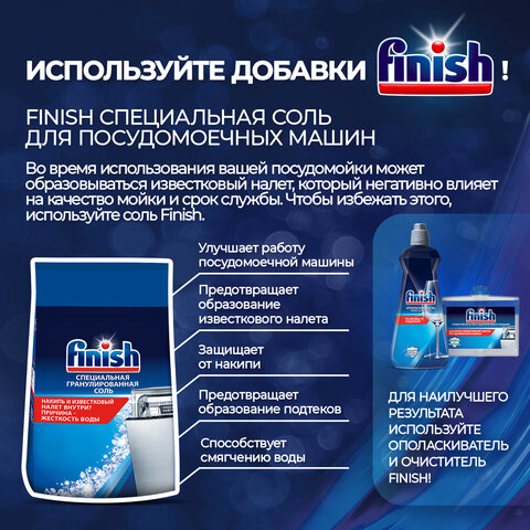 Специальная соль FINISH для защиты посудомоечной машины от известкового налета. Улучшает работу посудомоечной машины, смягчает воду, защищает от накипи, устраняет подтеки, предотвращает образование известкового налета.