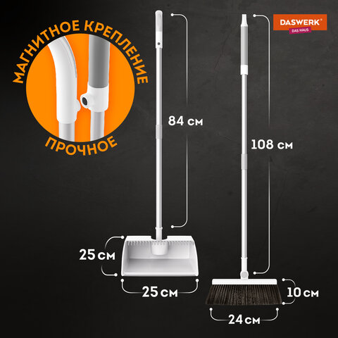 Совок для мусора КОМПЛЕКТ щетка + рукоятка совка 84см, щетки 63-108 см телескоп, магнитный держатель, бело-серый, колорбокс, DASWERK, 608950