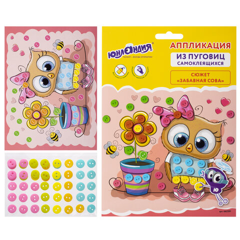 Аппликация из пуговиц ЮНЛАНДИЯ "Забавная сова" - это весёлый и занимательный способ развития мелкой моторики, аккуратности, цветового восприятия и фантазии ребёнка. Все элементы в составе самоклеящиеся, для работы не требуются ножницы и клей.