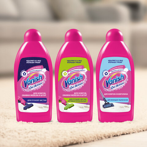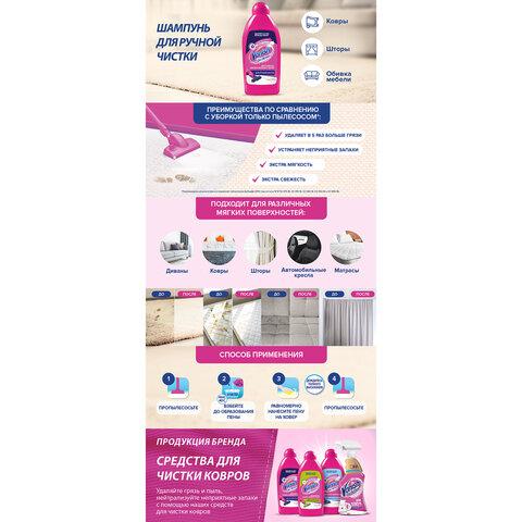 Шампунь VANISH "3 в 1" для ручной чистки ковров и обивки мебели. Шампунь глубоко проникает в волокна ковра, высвобождая частички грязи и выталкивая их на поверхность. Активный кислород в составе формулы позволяет удалить въевшиеся пятна.