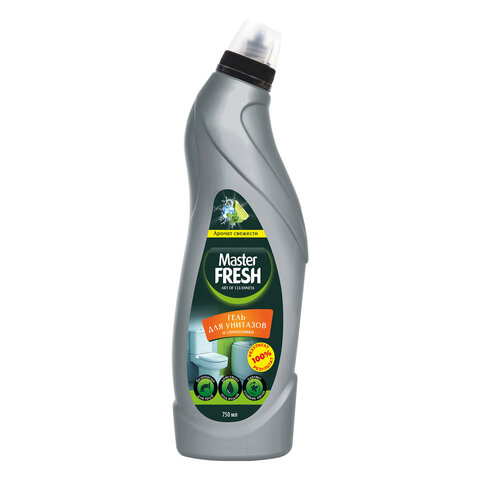 Средство для чистки унитазов и сантехники 750мл MASTER FRESH "Аромат свежести", гель. Новейшая формула на основе соляной кислоты бережно, но эффективно удаляет известковый налет и другие загрязнения. Подходит для других видов сантехники. Щадящий состав.