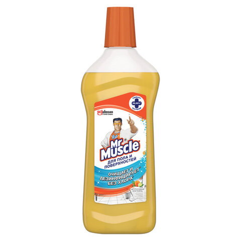 Средство для уборки дома МИСТЕР МУСКУЛ "Цитрусовый коктейль" подходит для очищения и дезинфекции напольных покрытий, включая плитку, ламинат, линолеум, пластик и керамогранит, а также плинтусов, раковин и других поверхностей. Нет хлора в составе.