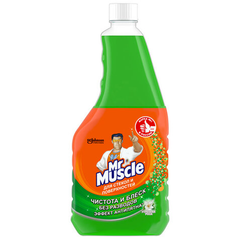 Чистящее средство для мытья стекол и поверхностей МИСТЕР МУСКУЛ "Утренняя Роса" эффективно удаляет пятна, следы от пальцев и другие загрязнения.