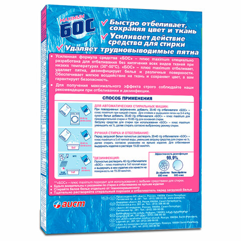Усиленная формула средства БОС плюс "Maximum" с максимальным содержанием активного кислорода специально разработана для отбеливания без кипячения всех видов тканей, включая шерсть и шёлк, при низких температурах (30°-50ºС).