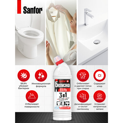 SANFOR "Белизна" гель 3 в 1 – специальное густое средство с инновационной формулой отбеливания и удаления пятен. Благодаря комплексному действию средство незаменимо при стирке, а также для дезинфекции и чистки сантехники и труб.