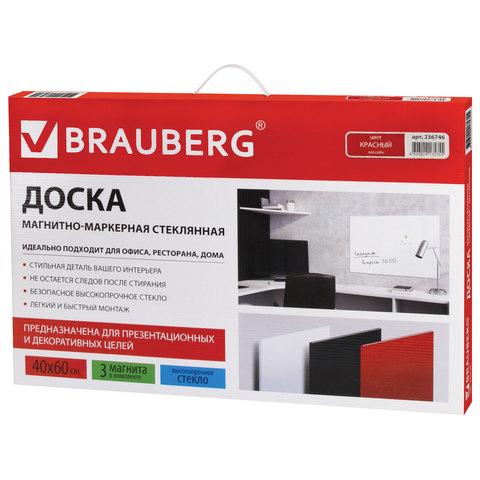 Доска магнитно-маркерная стеклянная 40х60 см, 3 магнита, КРАСНАЯ, BRAUBERG, 236746