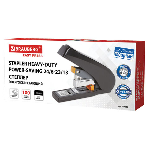 Степлер ЭНЕРГОСБЕРЕГАЮЩИЙ МОЩНЫЙ №24/6-23/13 BRAUBERG "Easy Press", до 100 листов, БЕЗ УСИЛИЙ, 224350