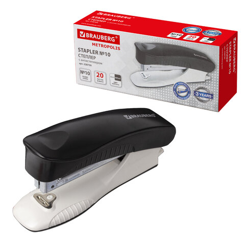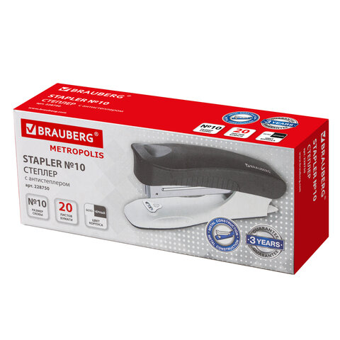 Степлер №10 BRAUBERG "METROPOLIS", до 20 листов, с антистеплером, черный, 228750