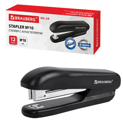 Степлер №10 BRAUBERG "SX-19", до 12 листов, с антистеплером, черный, 228587