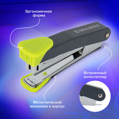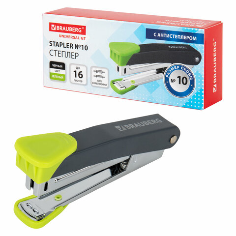 Степлер №10 металлический BRAUBERG "UNIVERSAL GT", до 16 листов, с антистеплером, зеленый, 272752