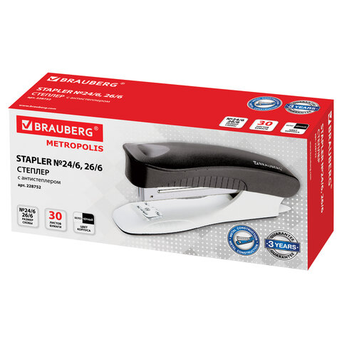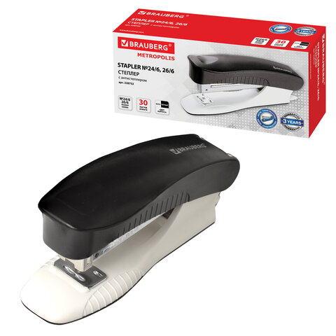 Степлер №24/6, 26/6 BRAUBERG "METROPOLIS", до 30 листов, черный, 228752