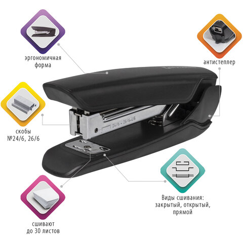 Степлер №24/6, 26/6 BRAUBERG "ULTRA", до 30 листов, с антистеплером, черный, 228756