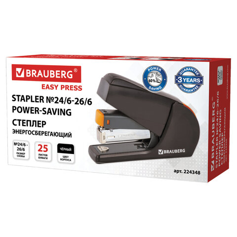 Степлер ЭНЕРГОСБЕРЕГАЮЩИЙ №24/6, 26/6 BRAUBERG "Easy Press", до 25 листов, БЕЗ УСИЛИЙ, 224348