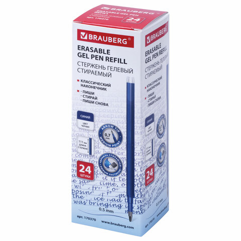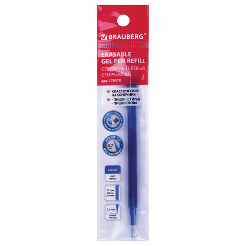 Стержень стираемый гелевый BRAUBERG 111 мм, СИНИЙ, евронаконечник, узел 0,7 мм, линия письма 0,5 мм, 170370