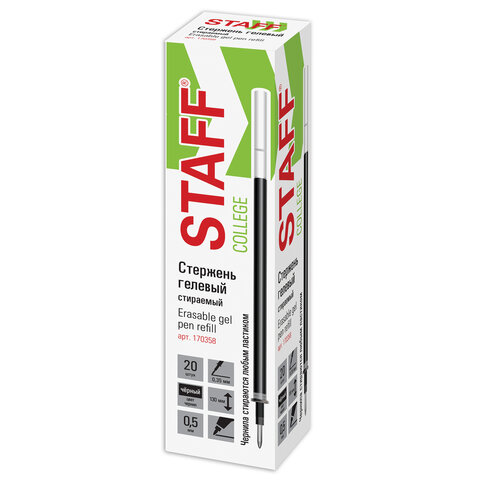 Стержень стираемый гелевый STAFF "College" EGPR-357, 130 мм, ЧЕРНЫЙ, узел 0,5 мм, линия письма 0,35 мм, 170358