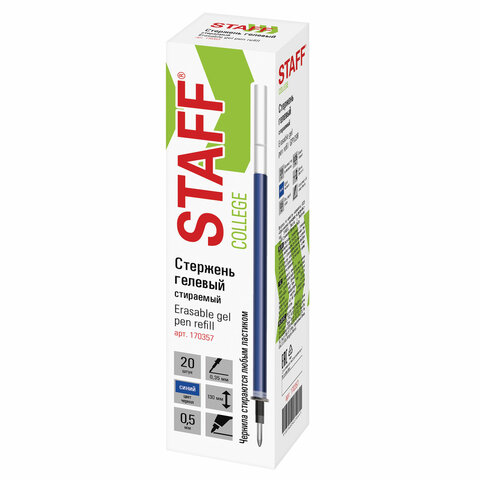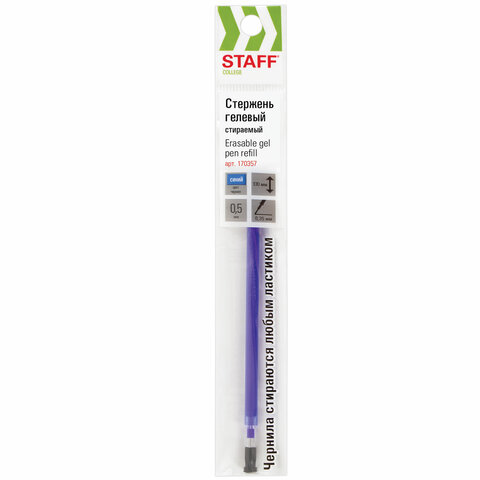 Стержень стираемый гелевый STAFF "College GP-109R" 130 мм, СИНИЙ, узел 0,5 мм, линия письма 0,35 мм, 170357