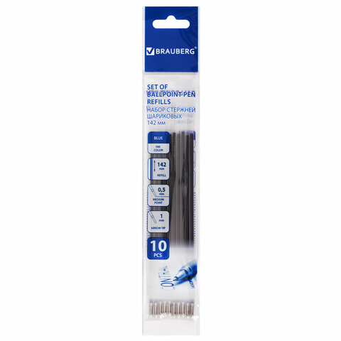 Стержень шариковый BRAUBERG 142 мм, НАБОР 10 штук, СИНИЙ, стандартный узел 1,0 мм, линия письма 0,5 мм, 170404