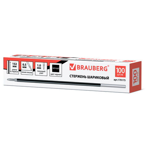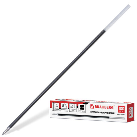 Стержень шариковый BRAUBERG 152 мм, ЧЕРНЫЙ, узел 1 мм, линия письма 0,5 мм, 170175
