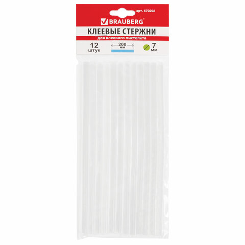 Клеевые стержни, диаметр 7 мм, длина 200 мм, прозрачные, комплект 12 шт., BRAUBERG, европодвес, 670292