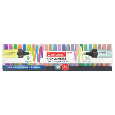 Набор текстовыделителей 24 ЦВЕТА на подставке, BRAUBERG "DELTA", 15 пастельных цветов + 9 неоновых цветов, линия 1-5 мм, 152506