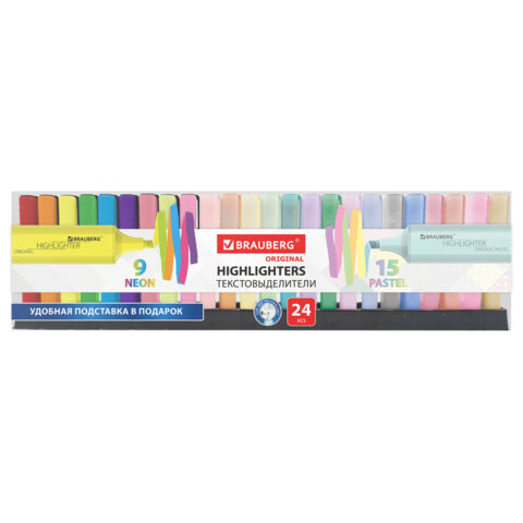 Набор текстовыделителей 24 ЦВЕТА на подставке, BRAUBERG "ORIGINAL", 15 пастельных цветов + 9 неоновых цветов, линия 1-5 мм, 152508