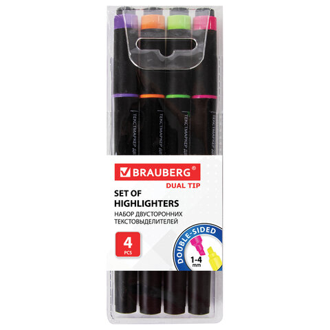 Набор текстовыделителей двусторонних BRAUBERG DUAL TIP 4 шт., АССОРТИ, линия 1-4 мм, 150845
