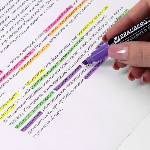 Текстовыделители BRAUBERG DUAL TIP предназначены для выделения текста на бумаге любого типа, включая факс-бумагу.