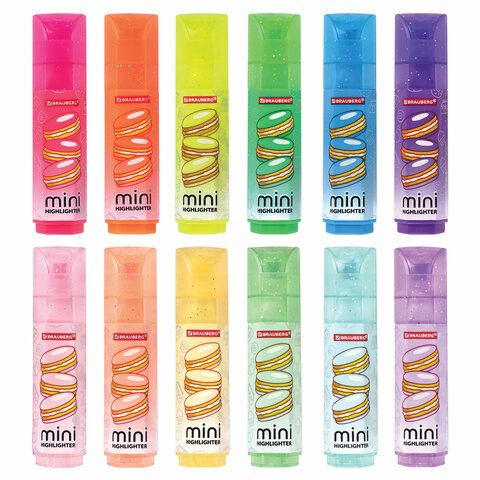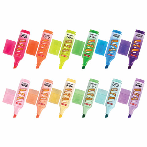 Набор текстовыделителей мини с принтами, 12 ЦВЕТОВ, BRAUBERG, 6 неоновых цветов + 6 пастельных цветов, линия 1-5 мм, 152537