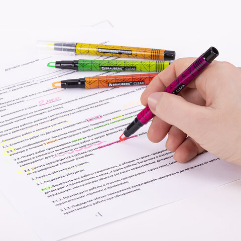 Текстовыделители BRAUBERG "Clear" предназначены для выделения текста на бумаге любого типа, включая факс-бумагу.
