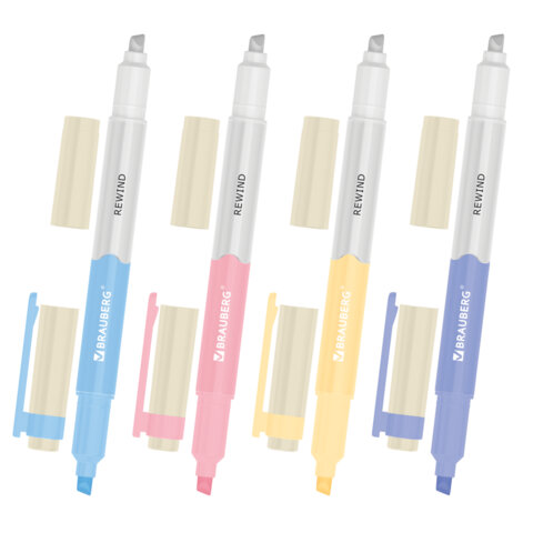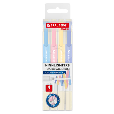 Набор текстовыделителей СТИРАЕМЫХ 4 ЦВЕТА, BRAUBERG "REWIND", двусторонние со стирателем, линия письма 1-4 мм, 152510