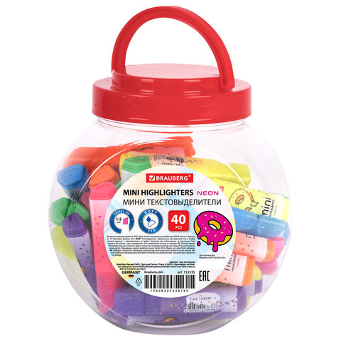 Текстовыделитель мини с принтами BRAUBERG "NEON", АССОРТИ В ПЛАСТИКОВОЙ БАНКЕ, 1-5 мм, 152535