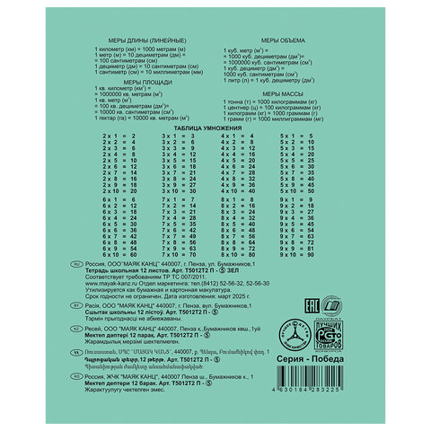 Тетрадь ЗЕЛЁНАЯ обложка 12 л., клетка с полями, "ПОБЕДА!", офсет, "Маяк", Т5012 Т2П-5