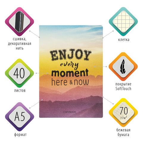 Тетрадь 40 л. в клетку обложка SoftTouch, бежевая бумага 70 г/м2, сшивка, А5 (147х210 мм), ENJOY THE MOMENT, BRAUBERG, 403766
