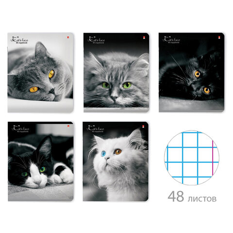Тетрадь А5 48 л. АЛЬТ скоба, клетка, глянцевый лак, "Кошки. Яркий взгляд" (5 видов), 7-48-1019