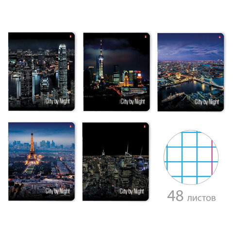 Тетрадь А5 48 л. АЛЬТ скоба, клетка, глянцевый лак, "Ночные города" (5 видов), 7-48-727