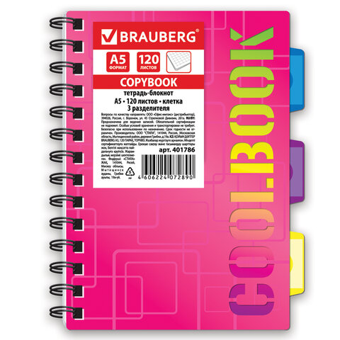 Тетрадь-блокнот 120 л., A5, 148x210 мм, BRAUBERG, клетка, гребень, обложка пластиковая, 3 разделителя, "CoolBOOK", 401786