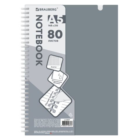 Тетрадь обложка пластик, А5 80 л., гребень мягкий, вырубка для ручки, клетка, BRAUBERG, серый, 405377
